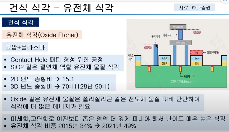 유전체 식각은 반도체 제조 공정에서 중요한 단계로, 반도체 칩의 여러 층 사이에 있는 유전체(절연체, 주로 SiO2 산화물) 물질을 제거하는 과정입니다. 이 과정은 전기적 연결을 만들기 위해 필수적입니다. 반도체 칩은 여러 층으로 이루어져 있으며, 각 층은 특정 기능을 수행합니다. 유전체 식각은 이러한 층 사이에 전기적 연결을 만들기 위해 사용됩니다.