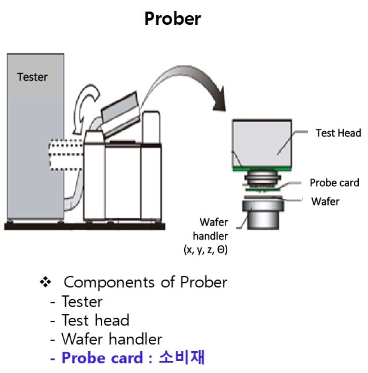 프로버(Prober)는 웨이퍼 테스터와 함께 사용되는 독립적인 장비로, 웨이퍼를 정확하게 위치시키고 프로브 카드(Probe Card)가 웨이퍼의 각 다이(die)에 전기적으로 접촉할 수 있도록 도와줍니다. 프로버는 웨이퍼를 이동시키고 정렬하여 프로브 카드가 올바르게 접촉할 수 있는 환경을 제공합니다.