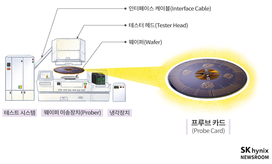 웨이퍼의 전극과 접촉하여 전기적 테스트를 수행하는 핵심 구성 요소입니다. 프로브 카드에는 여러 개의 프로브 핀이 장착되어 있으며, 웨이퍼의 각 다이에 정확히 접촉하여 전기 신호를 주고받습니다.