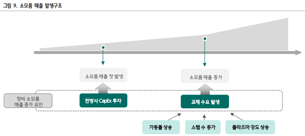 ㅁ 소모품 매출 발생구조 : 전방사 capex 투자시, 교체 수요 발생시
