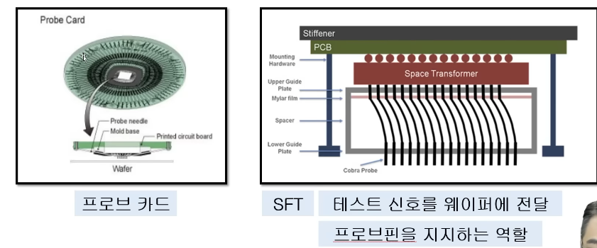 SFT : Space Transformer (완충역할. 세라믹 소재. 프로브 카드가 웨이퍼에 닿음. 이것을 100만회 이상 반복. 이때 PCB가 충격에 의해 손상될 가능성이 있는데 이것을 예방하기 위해 SFT가 있음.