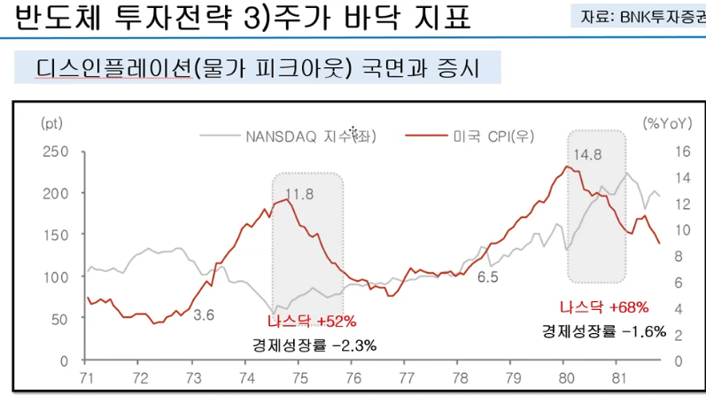 (내 생각. 물가가 떨어지기 시작하면 원재료 구입비와 각종 비용이 감소하기 시작. 이는 곧 이익의 증가를 의미. 또한, 물가가 하락하면 소비자의 구매력이 증가할 수 있기 때문에 주가가 상승할 수 있었던게 아닐까 싶음)