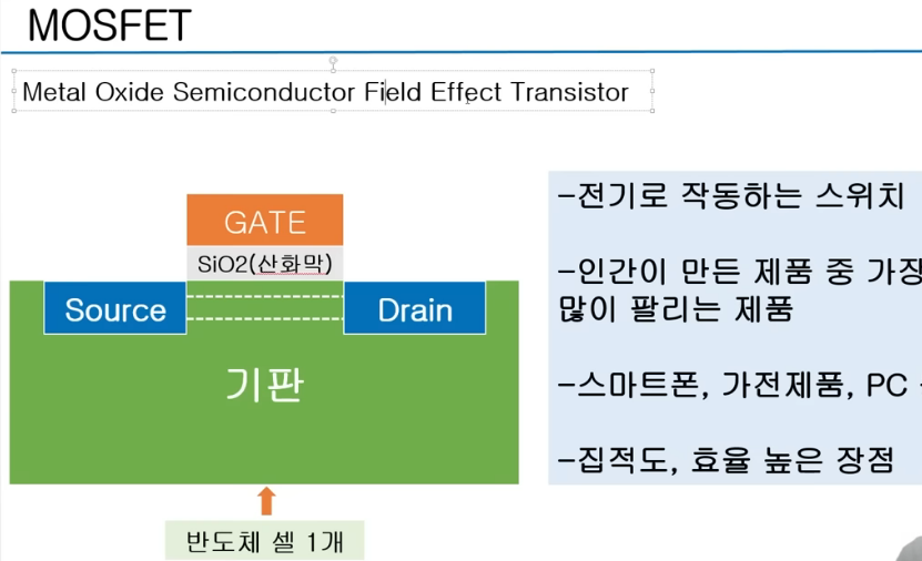 게이트가 스위치. 게이트에 전압을 가하면 소스에서 드레인으로 전류가 흐름.