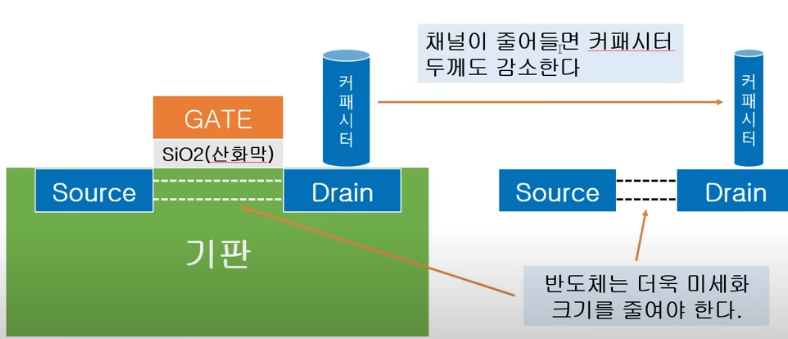 미세화가 진행될수록 소스와 드레인 사이의 간격이 점점 좁아짐.