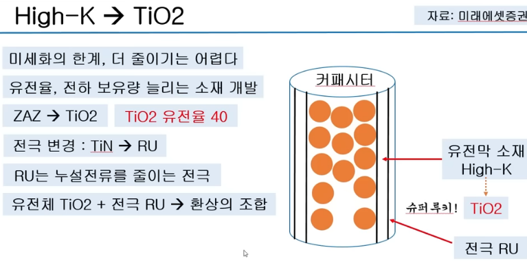 미세화가 진행될수록 커패시터는 점점 작아져 전하를 저장할 수 있는 능력이 점점 줄어들 수 밖에 없음. 구속된 전하가 떨어져 나가기 쉽다는 것. 이것을 막기 위해 커패시터를 High-k 소재로 (유전율이 높은 물질로) 증착시켜줌.
