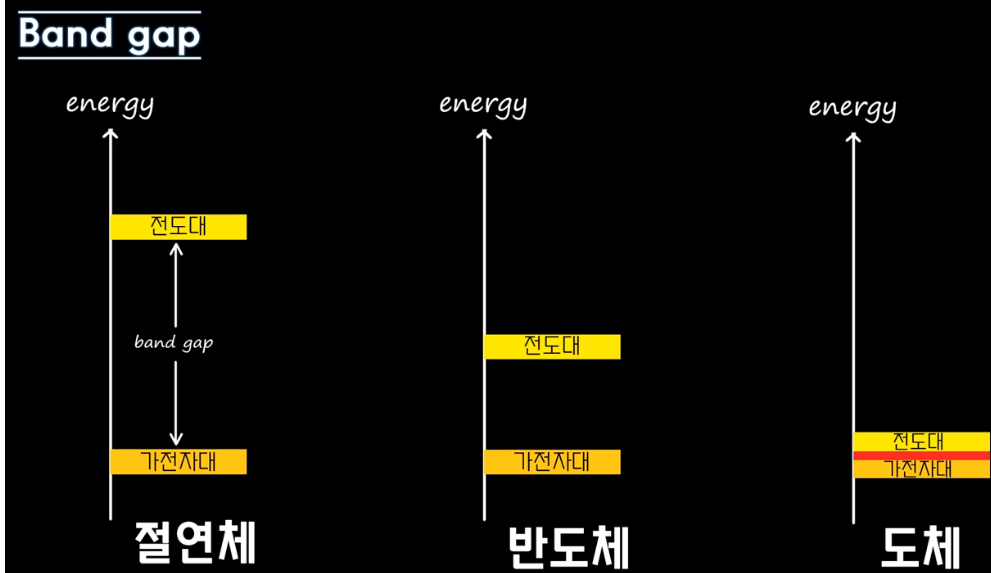 (구속전하가 에너지를 많이 흡수하면 구속력을 이기고 자유전자가 되는데, 자유전자가 될 수 있는 껍질까지 간 것을 전도대라고 이해하면 될 듯. 즉, 밴드갭(가전자대와 전도대 사이의 간격)이 클수록 절연이 잘됨. 밴드갭이 작을수록 약간의 에너지를 흡수해도 전도대로 넘어가기 때문에 도전성이 커짐)