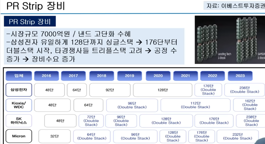 낸드가 고단화될수록 공정수가 증가하게 되고 (삼성도 176단부터 더블스택 시작, 다른 곳은 이미 2단) PR 스트립 장비 사용은 늘어날 수 밖에 없음.