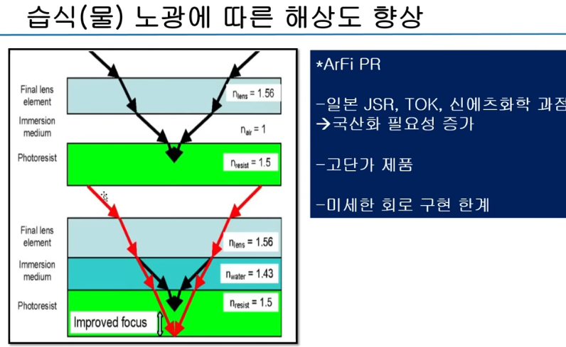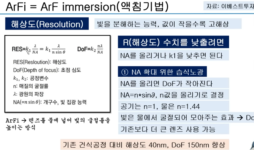 ArFi에서 i는 immersinon을 말하는 것으로 액침기법을 의미. 공기보다 물의 n값이 커 NA를 키워 해상도를 낮출 수 있게 됨.